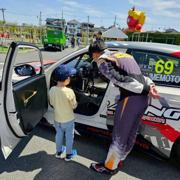 On the day of the event, Kota Umemoto, a development driver for Central Circuit, also participated. At the venue, Umemoto provided visitors with a detailed explanation of the TCR, a full-fledged racing car, and took commemorative photos with children and motorsports fans. He interacted with many people and helped raise awareness about traffic safety at this local traffic safety and community promotion event.